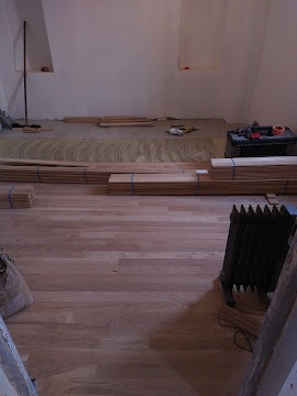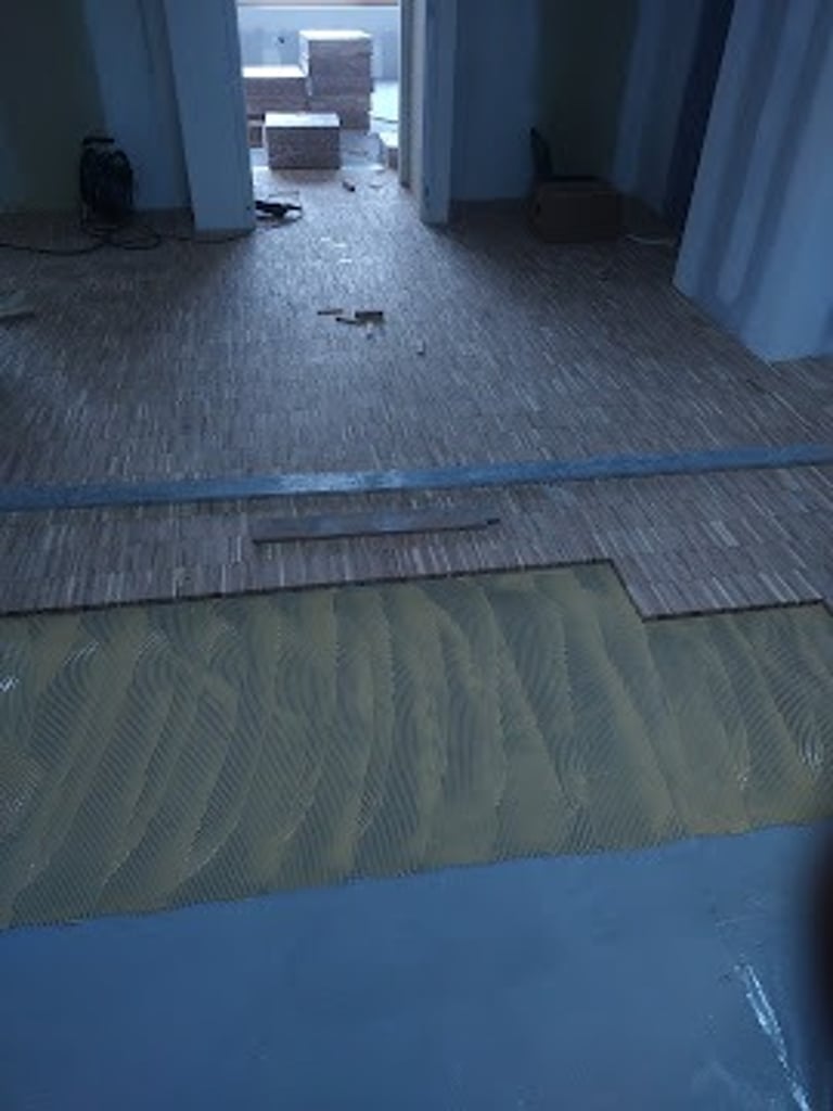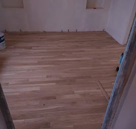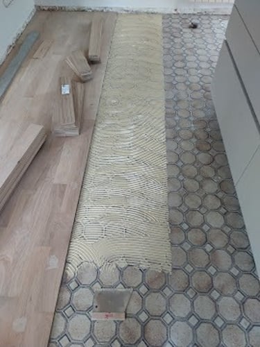 Le parquet collé est une pose en plein réalisée à l’aide d’une colle adaptée sur un support préparé (chape, dalle béton ou ancien revêtement compatible).